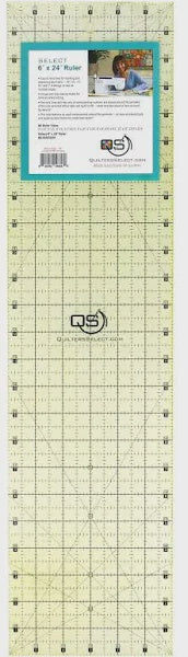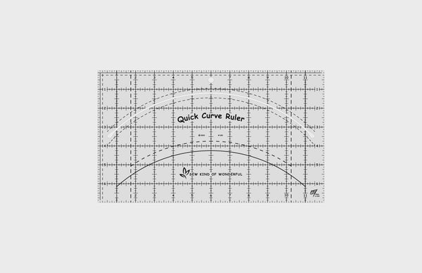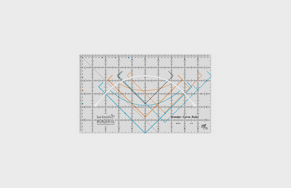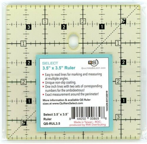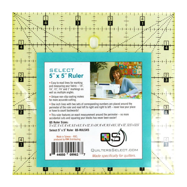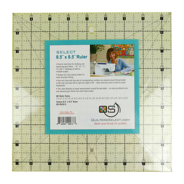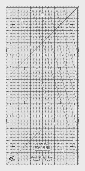 This 45 degree triangle cuts half-square triangles up to a finished size of 8 inches. Since the tip is trimmed, all squares and triangles can be cut from the same strip of fabric. A dashed 1/4 inch seam allowance is printed around the entire edge of the ruler.