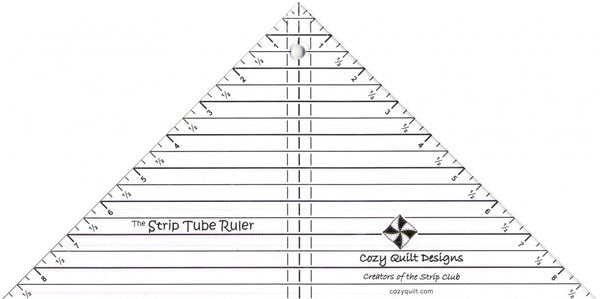 Stripology Squared Mini, the smallest ruler in the Stripology ruler family by Gudrun Erla, has all of the features of the Stripology Squared ruler (Item CGRGE2) plus a few additional features you will love. It includes markings to square up half-square triangles, quarter-square triangles, and blocks up to a 6 inch finished size. This smaller version of the Stripology Squared Ruler (Item CGRGE2) is easy to manipulate and makes squaring up blocks a breeze. Follow the easy-to-read markings: stars for 1 1/2 inch cuts - no math required! Turn the ruler around and use the markings on the opposite edge to cut 1/4 inch and 3/4 inch cuts. Or use the 1/8 and 3/8 inch dashed lines to cut eighth inch strips.